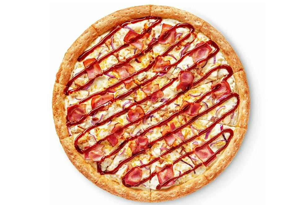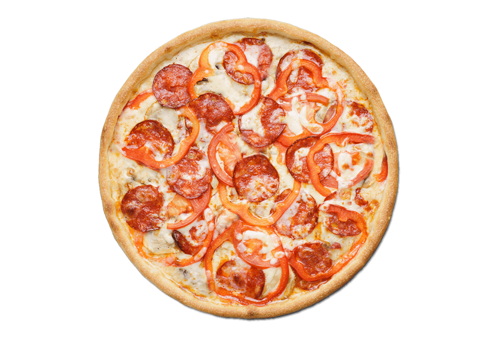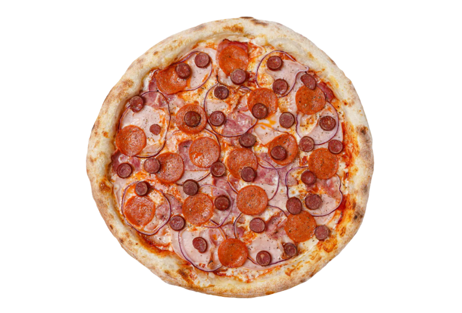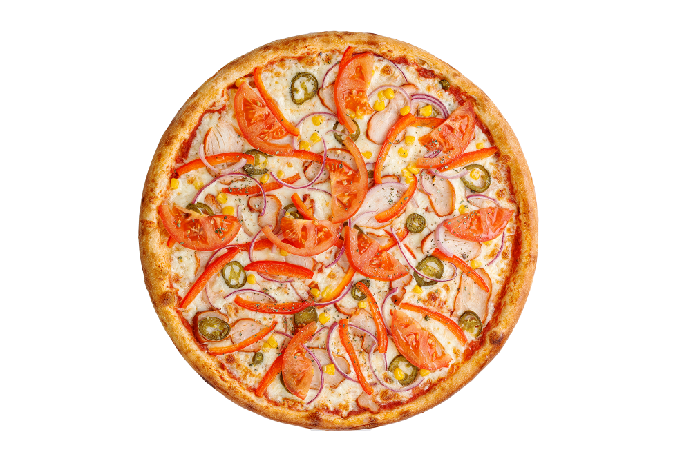 моцарелла, копчёная грудка, бекон, ветчина, красный лук, болгарский перец, перец халапеньо, соус томатный