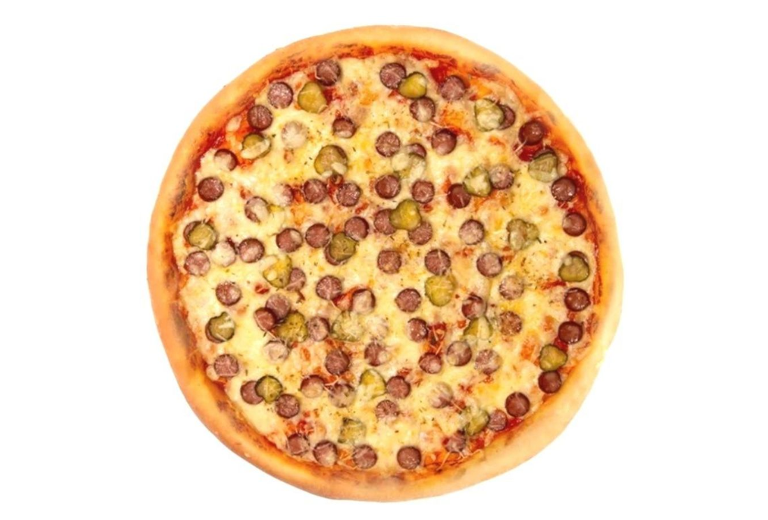 карбонат, охотничьи колбаски, огурец маринованный, лук маринованный, сыр моцарелла, соус белый