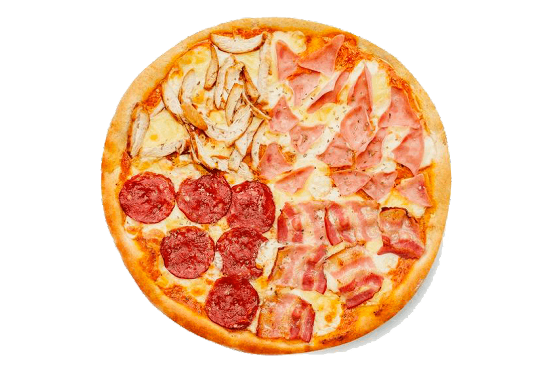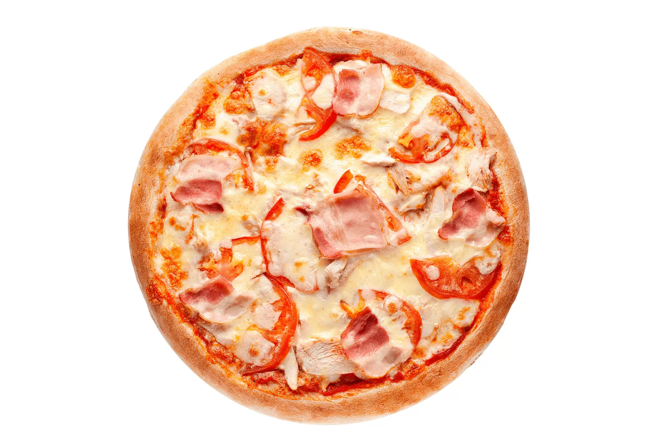 карбонат, куриное филе, ветчина, пепперони, лук, перец болгарский, сыр моцарелла, грибы, томат, соус томатный, соус белый